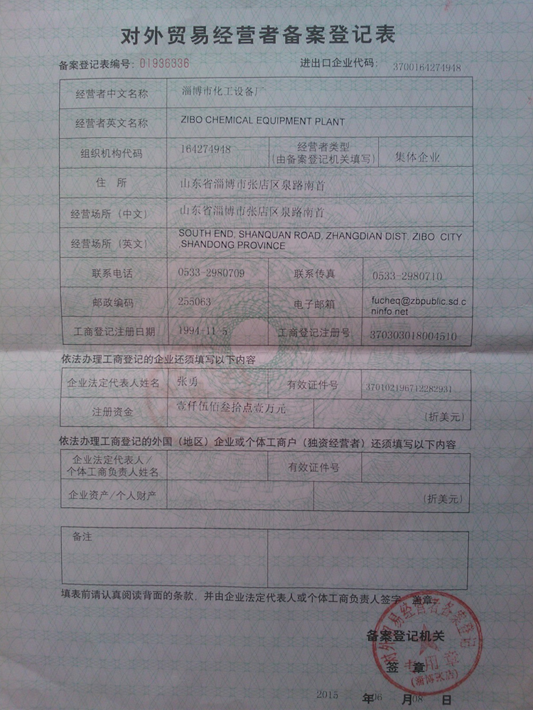 淄博市化工设备厂联系人:张勇 13505330686 电 话:0533-2980884 2980885 2980579 2980709 传 真:0533-2980710 邮 编:255063 E-mail:zcep@chenbao96360.cn fucheq@zb-public.sd.cninfo.net 网 址://chenbao96360.cn 厂 址:山东省淄博市张店区山泉路南首